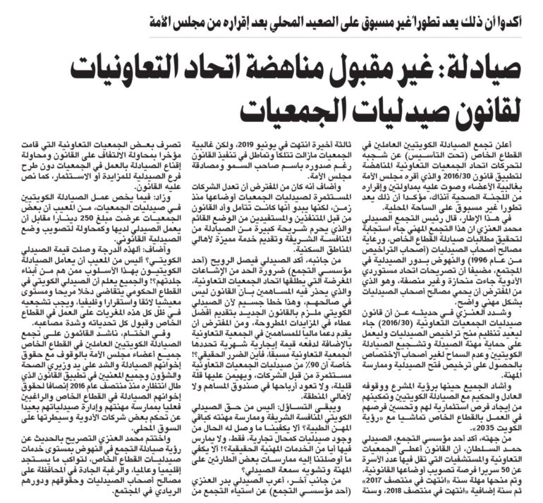 وأشاد الجميع حينها برؤية المشّرع ووقوفه العادل والحكيم مع الصيادلة الكويتيين وتمكينهم من إيجاد فرص استثمارية لهم وتحسين فرصهم في العمل بالقطاع الخاص تماشيا مع رؤية الكويت 2035.